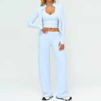 Your all-in-one outfit for workouts and off-duty days. This 3-piece set includes a sleek zip-up jacket, a supportive sports bra, and flowy wide-leg pants for an effortless, elevated look. The fitted jacket features a stand collar and full zip for easy layering, while the bra offers a flattering neckline and stay-put comfort. Finished with a smooth, high-rise waistband and relaxed wide-leg silhouette, the pants move beautifully from studio sessions to travel days. Key Features 3-piece set: zip-up jacket + sports bra + wide-leg pants Fitted jacket with stand collar for a clean, sculpted look Full-zip front for adjustable coverage and easy layering High-rise waistband for a smooth, comfortable fit Wide-leg pants for breathable, effortless movement Ideal for yoga, pilates, warm-ups, walking, travel, and everyday athleisure