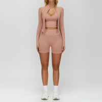 A clean, sculpting activewear set made for training and everyday wear. The fitted zip-up jacket layers smoothly over the matching V-neck crop tank, while the high-waist biker shorts provide a secure, flattering fit that stays in place. Soft, stretchy, and streamlined—perfect for gym sessions, yoga, pilates, walking, and athleisure styling. Key Features: 3-piece set: zip jacket + crop tank + biker shorts Seamless, body-contouring fit with a smooth finish Stand collar and full-zip front for easy on/off High-rise waistband for comfortable support Flexible stretch for movement and all-day comfort