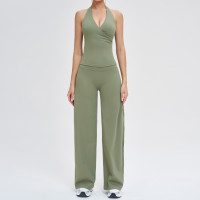 A sleek, studio-to-street set that blends support with effortless drape. The halter wrap-front tank creates a flattering neckline and sculpted fit, while the high-waist wide-leg pants elongate the legs with a relaxed, flowy silhouette. Ideal for yoga, pilates, travel, lounging, or elevated everyday athleisure. Key Features: 2-piece matching set: halter wrap tank + wide-leg pants Wrap-front neckline for a flattering shape High-rise waistband for a smooth, secure fit Wide-leg cut for comfort and leg-lengthening style Perfect for light workouts, errands, and casual dressing