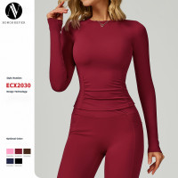 Premium Nude-Feel Yoga Sports Top: Slim-fit long sleeves with tummy control, perfect for outdoor running & fitness. OEM, ODM, wholesale available.